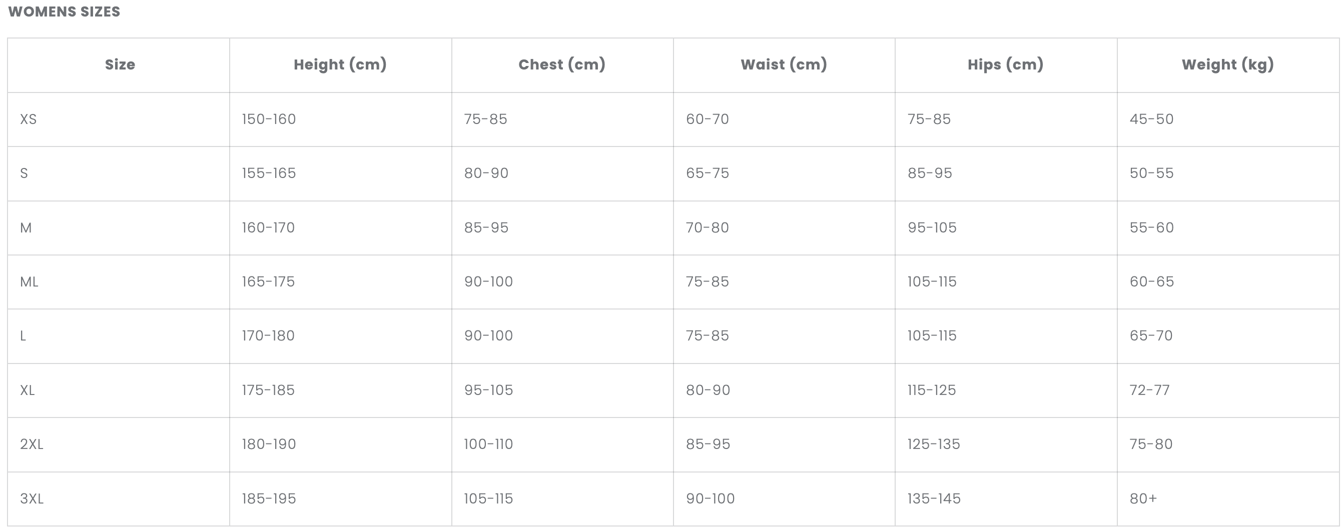 Måleskjema våtdrakt - Dame