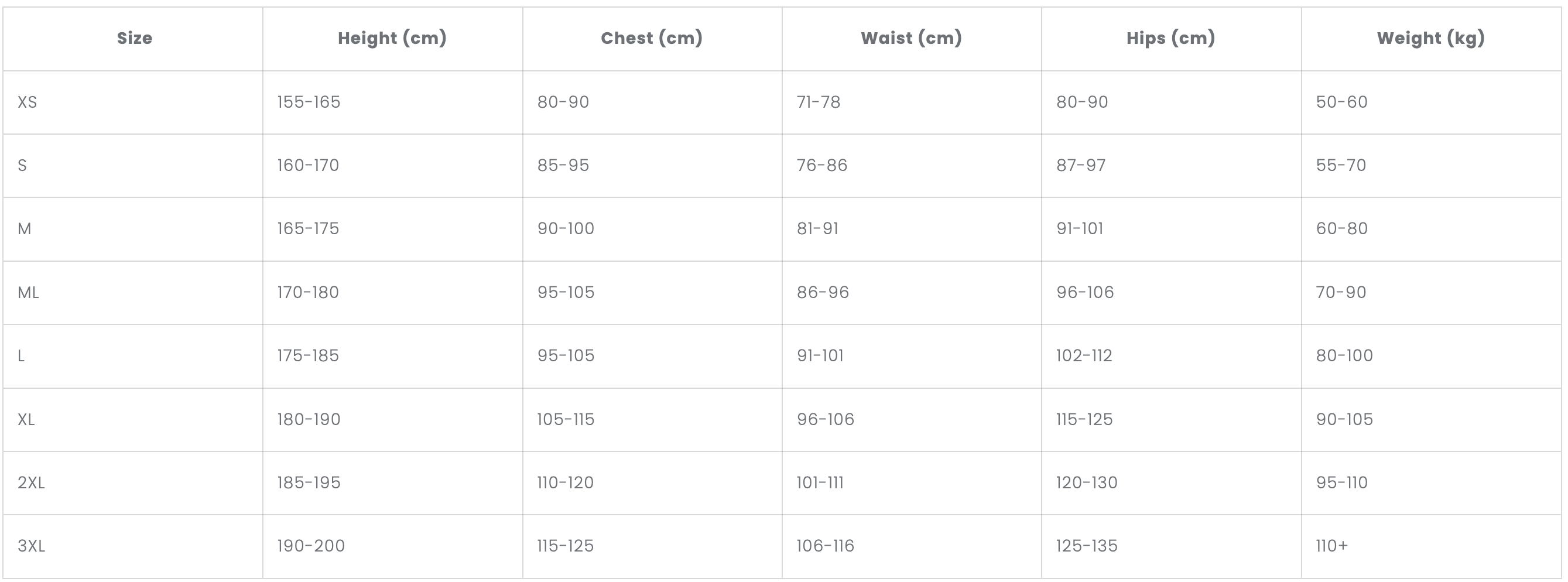 Måleskjema våtdrakt - Mann